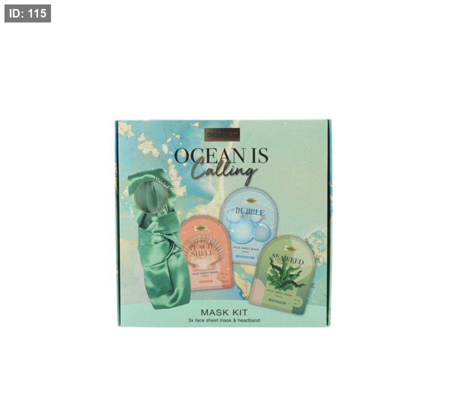 المنتج في الصورة هو مجموعة أقنعة "Ocean Is Calling" من Sence. تتضمن المجموعة ثلاثة أقنعة ورقية للوجه وعصابة رأس.