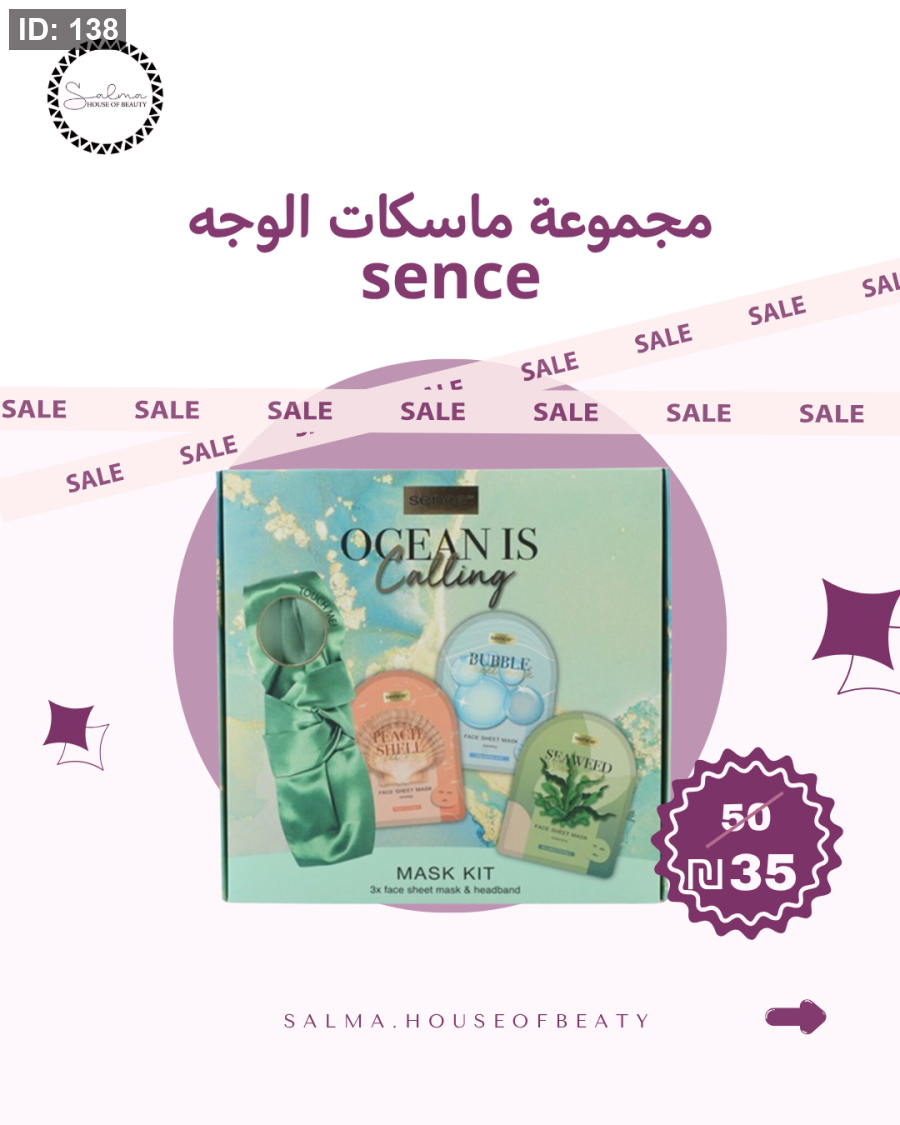 المنتج في الصورة هو مجموعة أقنعة "Ocean Is Calling" من Sence. تتضمن المجموعة ثلاثة أقنعة ورقية للوجه وعصابة رأس.